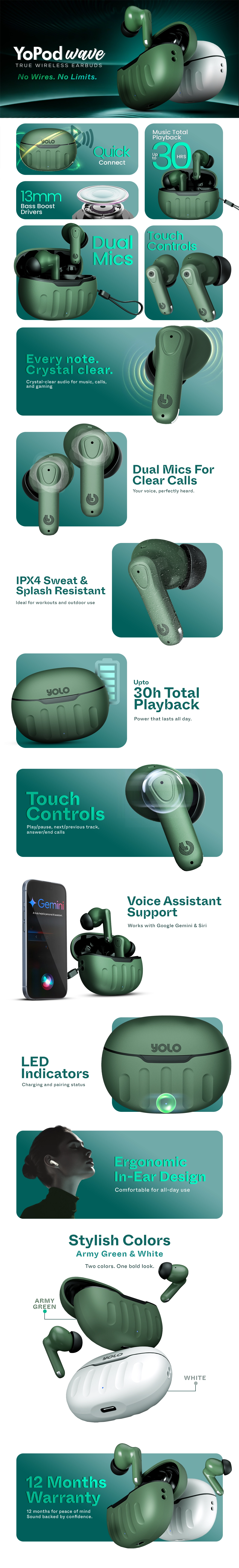 The YoPod Wave Wireless Earbuds are available in stylish Army Green and White colors to match your personality. With a 12-month warranty, you get peace of mind along with premium performance.